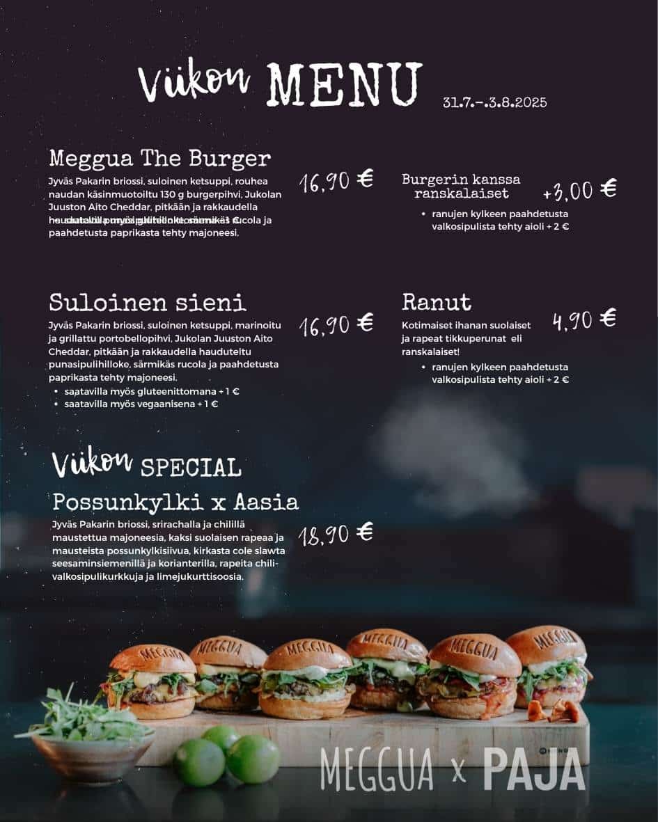 Koko kesän ajan on tarjolla meidän kaikista suosituin burgeri, klassikko ja arkkityyppi, kuten tätä burgeria on kuullut kutsuttavan. Meggua The Burger on tarjolla heti avajaisista lähtien. Tämän burgerin saa myös vegaanisena, kasvisversiona sekä gluteenittomalla sämpylällä. Burgerin kylkeen on tarjolla ranuja, kuten me ranskalaisia kutsumme ja paahdetusta valkosipulista tehtyä aiolia.
