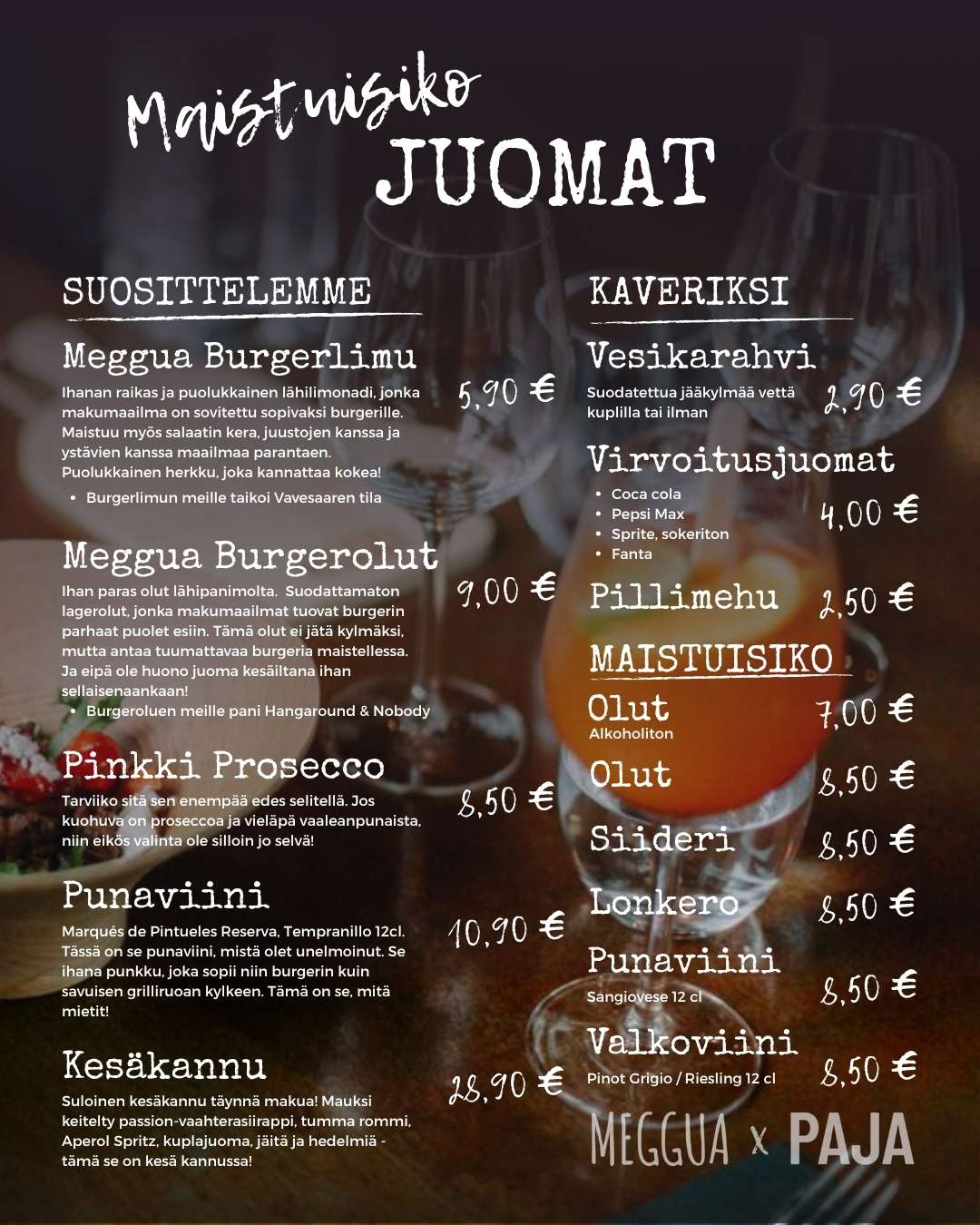 Meggua käyttää parhaimpia parhaimpia raaka-aineita, paikallisia tuotteita ja valmistaa hillokkeet ja soosit sekä makumaailmat niin, että ne jättävät jäljen sydämeen. Ravintola haluaa tarjota rennon tunnelman, harkitun ja mietityn makupaletin sekä palvelun, joka hurmaa kävijän. Meille voit poiketa illalliselle, after workille tai istumaan iltaa ystävien kanssa – nauttimaan ruoasta ja tunnelmasta.